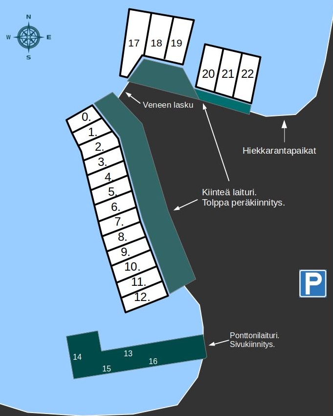 Laiturin käyttömaksu 250e/kausi tai 50e/kerta.